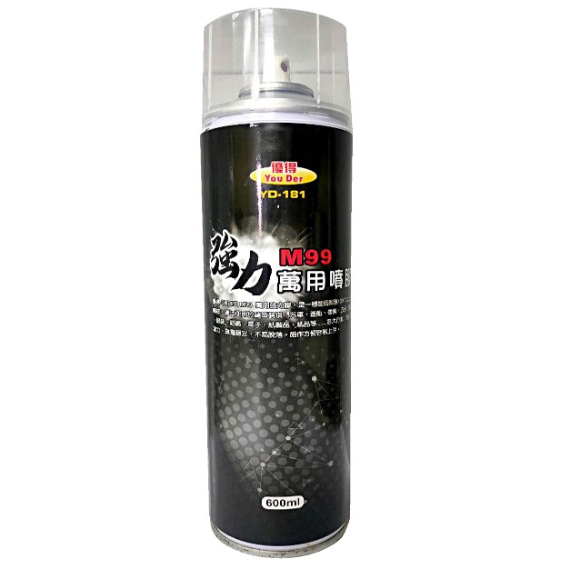 優得 SUPER M99 萬用強力膠,是一種能夠耐溫100℃以上的噴膠,廣泛使用於建築裝璜、汽車,造船、傢俱、五金、塑膠、服裝,紡織、電子、紙製品、紙品等........各大行業,較佳黏著力,質量穩定,不易脫落。施作方便容易上手。